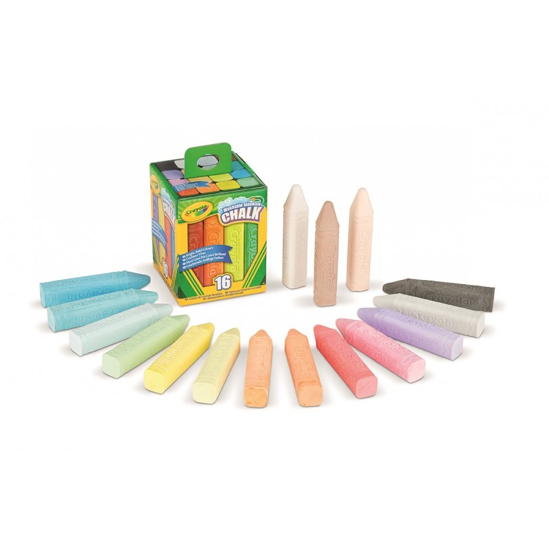 Tizas para exteriores en 16 colores brillantes y vibrantes. Cada tiza tiene un gran y cómodo mango en forma de paralelogramo para que sea fácil de agarrar y antideslizante, y su gran diámetro la hace especialmente resistente a los choques con el asfalto.